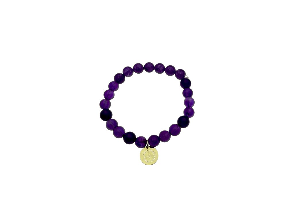 Jedinečné spojenie elegancie a pozitívnej energie. Tento náramok vyrobený z ametystu zdobí zlatý štvorlístok zo 14-karátového žltého zlata, ktorý symbolizuje šťastie, lásku a harmóniu. Ametyst prináša pokoj a vnútornú rovnováhu, zatiaľ čo zlatý detail dodáva šperku luxusný nádych.