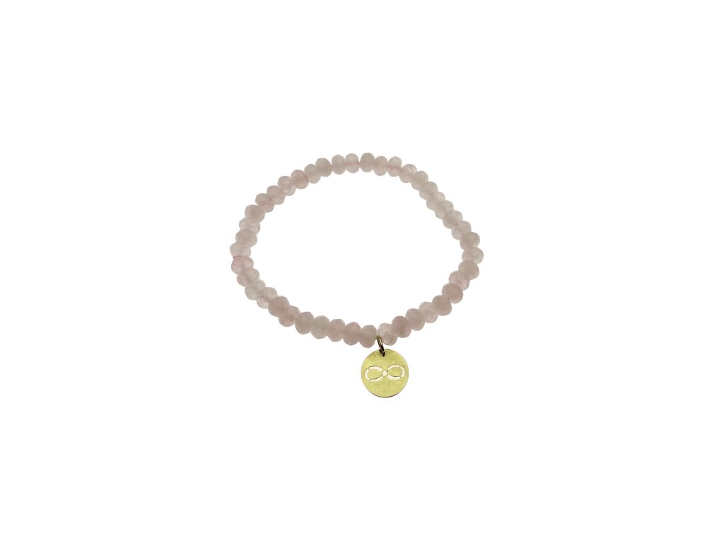 Jemný ruženínový náramok s nekonečnom zo 14-karátového žltého zlata vyžaruje nežnosť, lásku a vnútorný pokoj. Ruženín, kameň srdca, podporuje sebalásku, empatiu a emocionálnu rovnováhu, zatiaľ čo symbol nekonečna predstavuje večnú lásku a nekonečné spojenie duší.