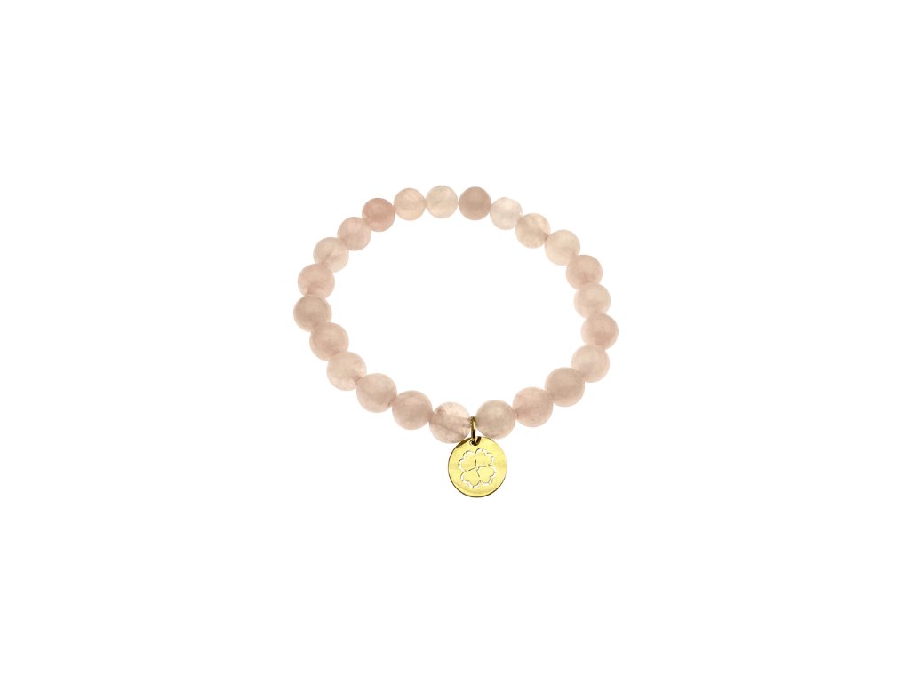 Nežný ruženínový náramok doplnený o zlatý štvorlístok zo 14-karátového žltého zlata spája v sebe lásku, harmóniu a šťastie. Ruženín, známy ako kameň srdca, podporuje sebalásku, emocionálnu rovnováhu a vnútorný pokoj, zatiaľ čo štvorlístok prináša šťastie, vieru, nádej a lásku.